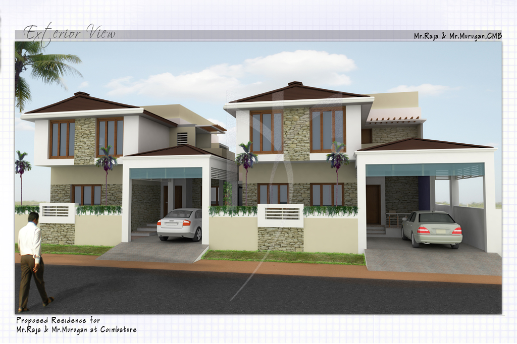 An almost identical twin house in the outskirts of Coimbatore. The area available to design each building was very economical. Inside the house the OTS which connects the hall to the pantry floods the house with light. Bed rooms are well ventilated with maximum storage and the client was very happy with modern kitchen. The elevation is stone cladded done by local Kerala artisans.