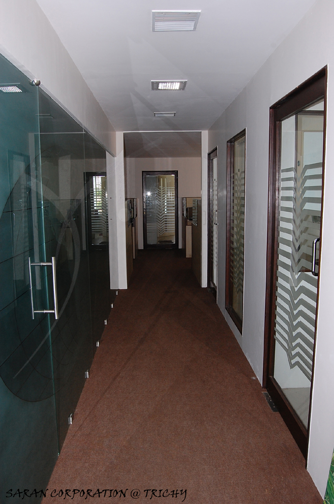 In the business part of the city, we made this office for a Japan based company. Glass was used in immense. A massive 18’ long toughened glass with the globe worked on it marking the number of branches they have around the globe, makes the hallway more interesting, connecting the serious work space to the elegant business space.